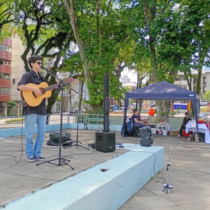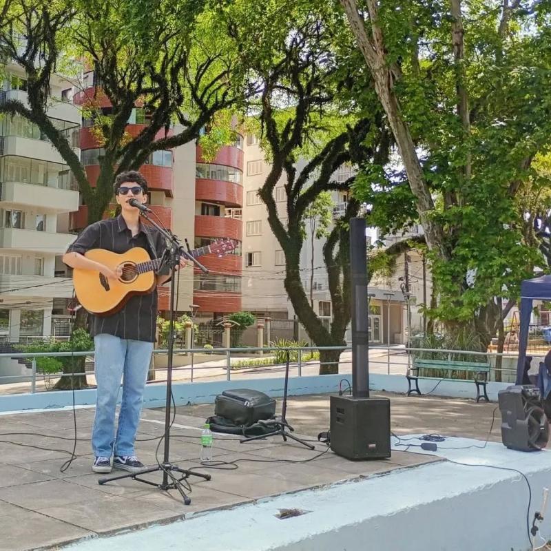 Cantora Jaiane Trivelin cantando na Espaço Aberto na Praça Vico Barbieri, na Programação do Talentos na Praça.