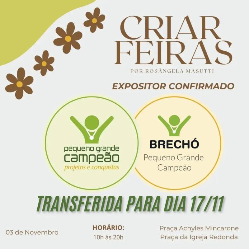 Devido a possibilidade de chuva e mal tempo, a Criar Feiras foi transferida para o dia 17/11.
