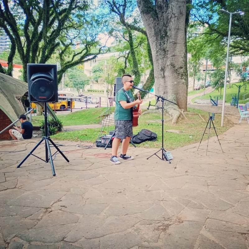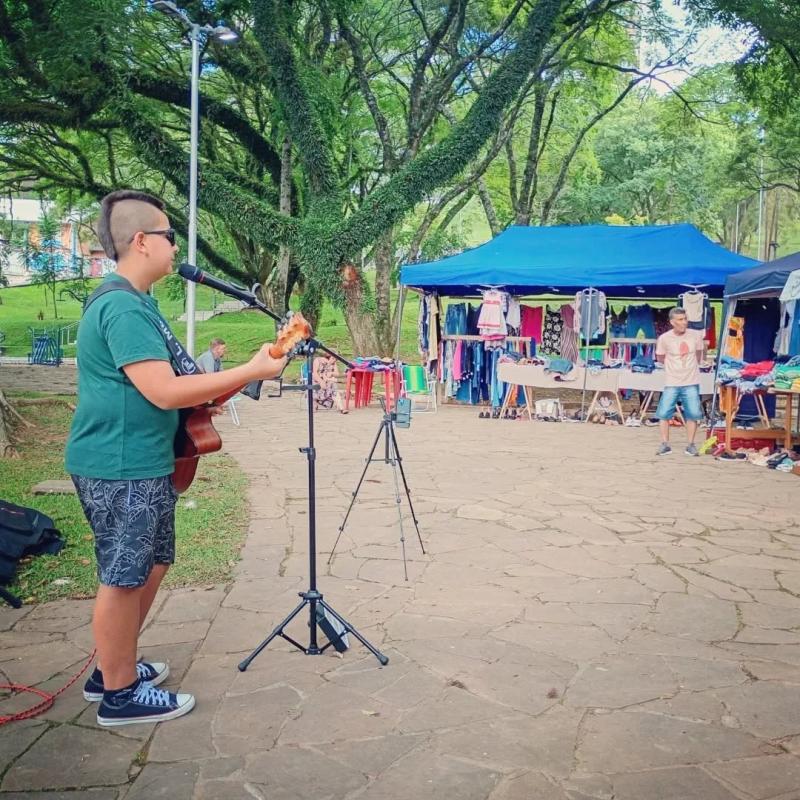 Tarde ao Som deste Grande Fera da Música, jovem Lucas do Vikings do Sul toca e canta durante a Programação do Brique da Praça, na Praça Centenário.