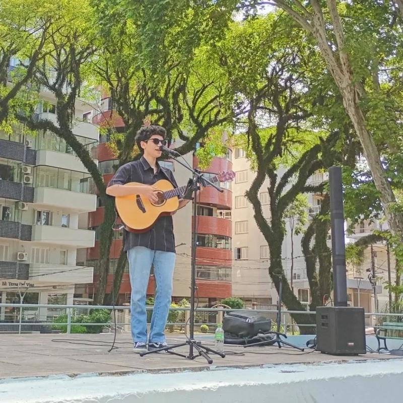 Cantora Jaiane Trivelin cantando na Espaço Aberto na Praça Vico Barbieri, na Programação do Talentos na Praça.