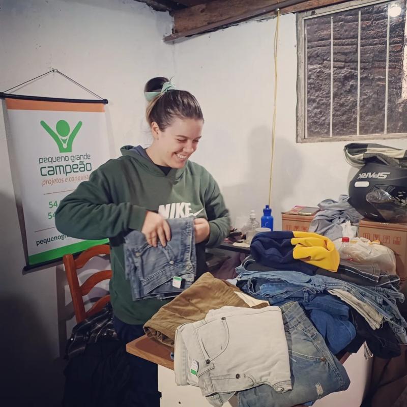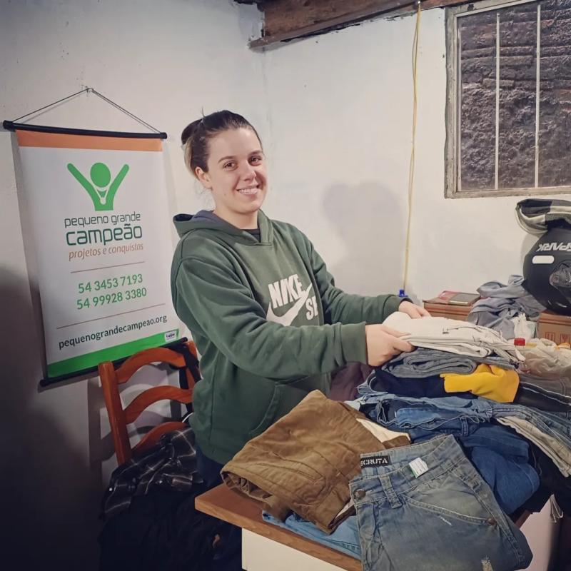 Domingo no Brechó Beneficente da Pequeno Grande Campeão. Voluntária Maria separando, revisando e organizando.