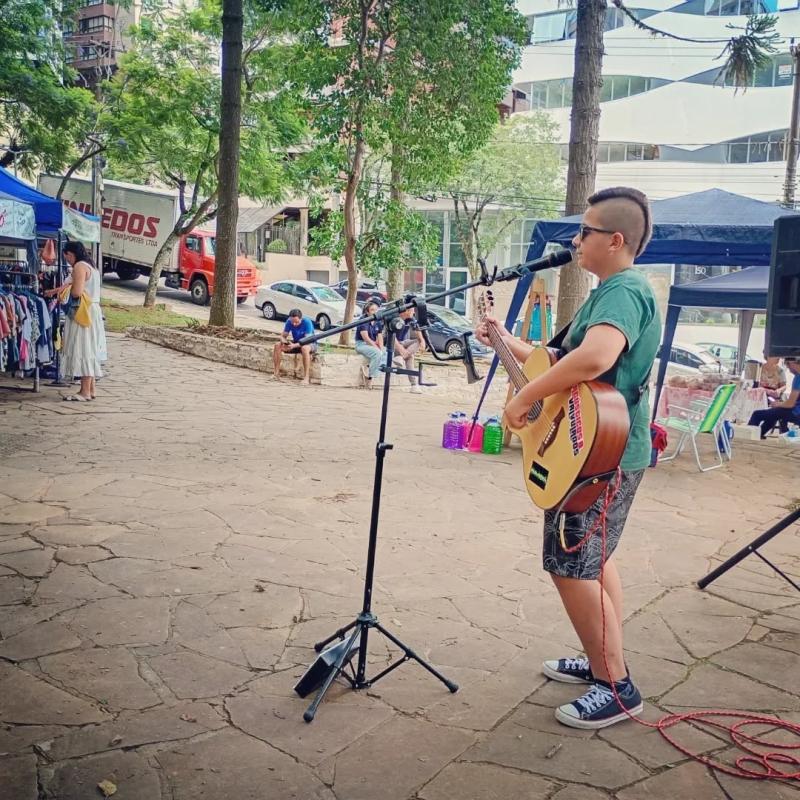 Tarde ao Som deste Grande Fera da Música, jovem Lucas do Vikings do Sul toca e canta durante a Programação do Brique da Praça, na Praça Centenário.