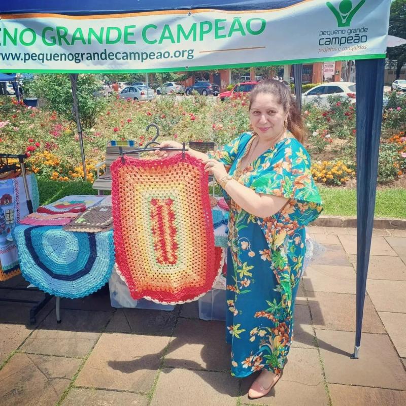 Ontem (21/01) teve o Arte na Praça. Em Espaço da Pequeno Grande Campeão contamos com a presença da Artesã e Voluntária Roseli, apresentando os trabalhos e animando a feira Arte na Praça. Junto estiveram presentes os Sres. Jeferson e a Maria, na Praça das Rosas (da Igreja Cristo Rei, das 9hs 30 às 18hs).