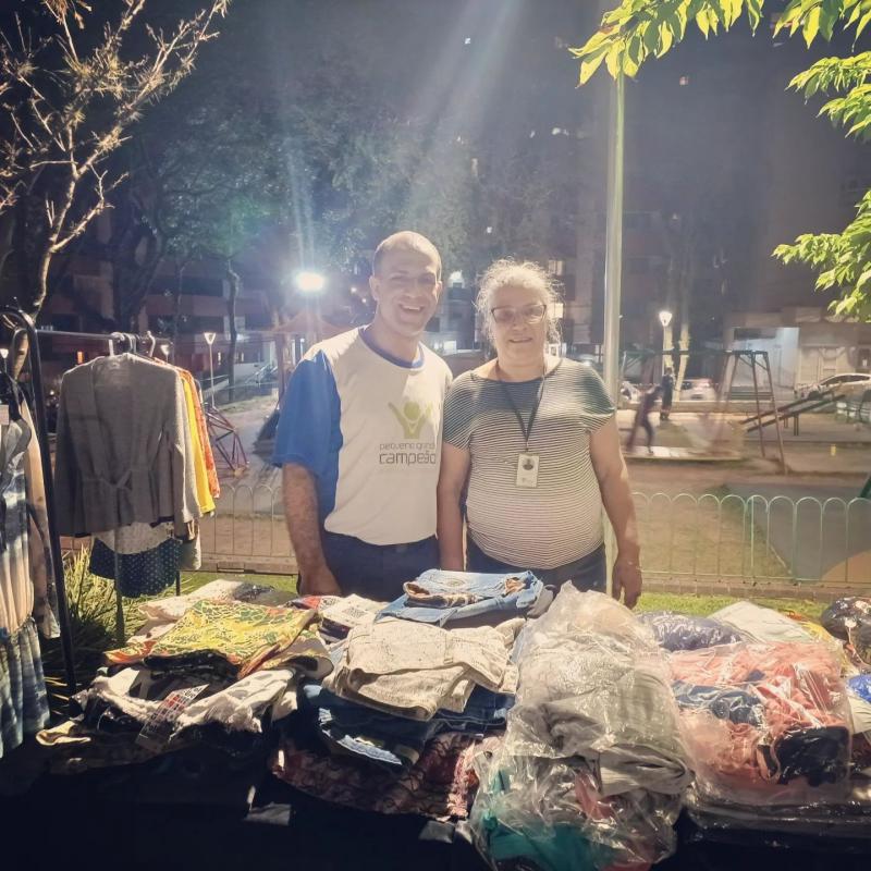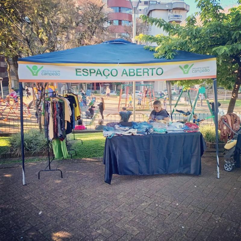 Pequeno Grande Campeão participa pela 1ª vez de edição do Brique da Vico, que aconteceu na Praça Vico Barbieri em Bento, das 14hs às 21hs. Em espaço da Pequeno Grande Campeão foi comercializado roupas com os voluntários Jeferson e Maria. Organizadora da Feira, Sra. Daniela, acompanhou participação da ONG, desde 14hs às 19hs, que foi o período em que a Pequeno Grande Campeão participou da Feira.