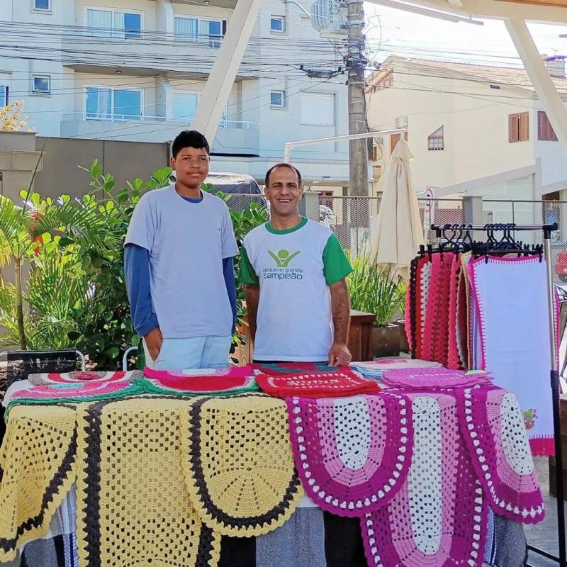 Pequeno Grande Campeão participa de edição Especial de Páscoa da EcoFeira em Garibaldi no Boulevard. Voluntários Jeferson, Maria e Robert cuidaram do Espaço do Artesanato da ONG durante a programação do evento. Feira atualmente segue aos cuidados de Elisandra e Gabriel, que comemoram o Sucesso do Projeto.